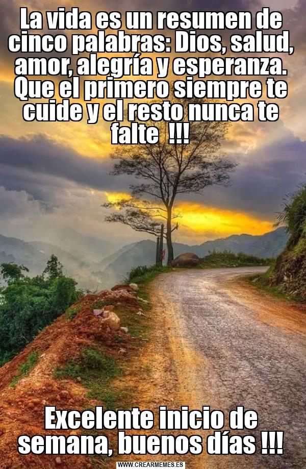 La vida es un resumen de cinco palabras: Dios, salud, amor, alegría y esperanza. Que el primero siempre te cuide y el resto nunca te falte !!! Excelente inicio de semana, buenos días !!!