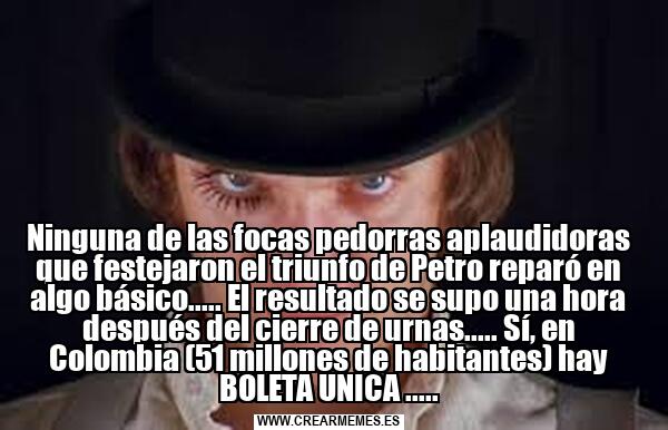Ninguna de las focas pedorras aplaudidoras que festejaron el triunfo de Petro reparó en algo básico..... El resultado se supo una hora después del cierre de urnas..... Sí, en Colombia (51 millones de habitantes) hay BOLETA UNICA .....