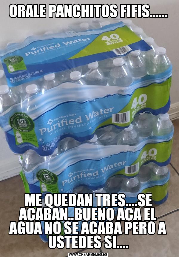 ORALE PANCHITOS FIFIS...... ME QUEDAN TRES....SE ACABAN..BUENO ACA EL AGUA NO SE ACABA PERO A USTEDES SI....
