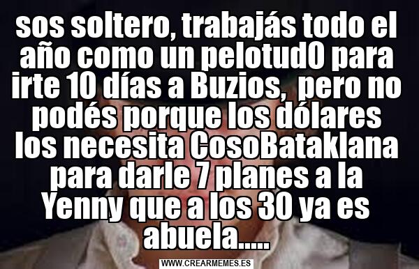 sos soltero, trabajás todo el año como un pelotud0 para irte 10 días a Buzios, pero no podés porque los dólares los necesita CosoBataklana para darle 7 planes a la Yenny que a los 30 ya es abuela.....