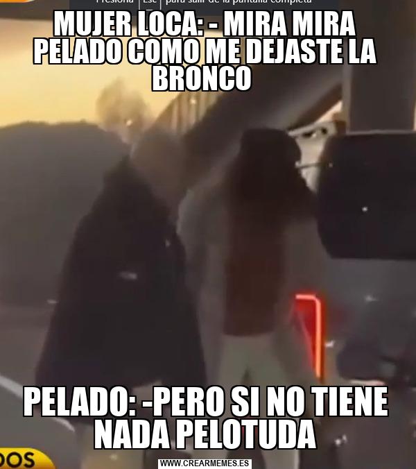 MUJER LOCA: - MIRA MIRA PELADO COMO ME DEJASTE LA BRONCO PELADO: -PERO SI NO TIENE NADA PELOTUDA