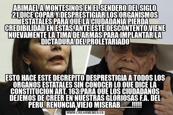 ABIMAEL A MONTESINOS EN EL SENDERO DEL SIGLO 21,DICE COPAR Y DESPRESTIGIAR LOS ORGANISMOS ESTATALES PARA QUE LA CIUDADANIA PIERDA CREDIBILIDAD EN ESTAS, ANTE ESTE DESCONTENTO VIENE NUEVAMENTE LA TIMA DE ARMAS PARA IMPLANTAR LA DICTADURA DEL PROLETARI ESTO HACE ESTE DECREPITO DESPRESTIGIA A TODOS LOS ORGANOS ESTATALES SIN CONOCER LO QUE DICE LA CONSTITUCION ART. 163.PARA QUE LOS CIUDADANOS DEJEMOS DE CREER EN NUESTRAS GLORIOSAS F.A. DEL PERU. RENUNCIA VIEJO MISERAB........!!!!!