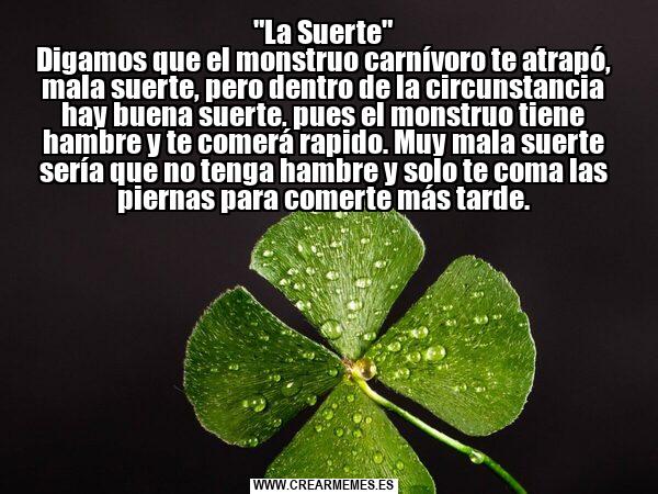 "La Suerte" Digamos que el monstruo carnívoro te atrapó, mala suerte, pero dentro de la circunstancia hay buena suerte, pues el monstruo tiene hambre y te comerá rapido. Muy mala suerte sería que no tenga hambre y solo te coma las piernas para comer