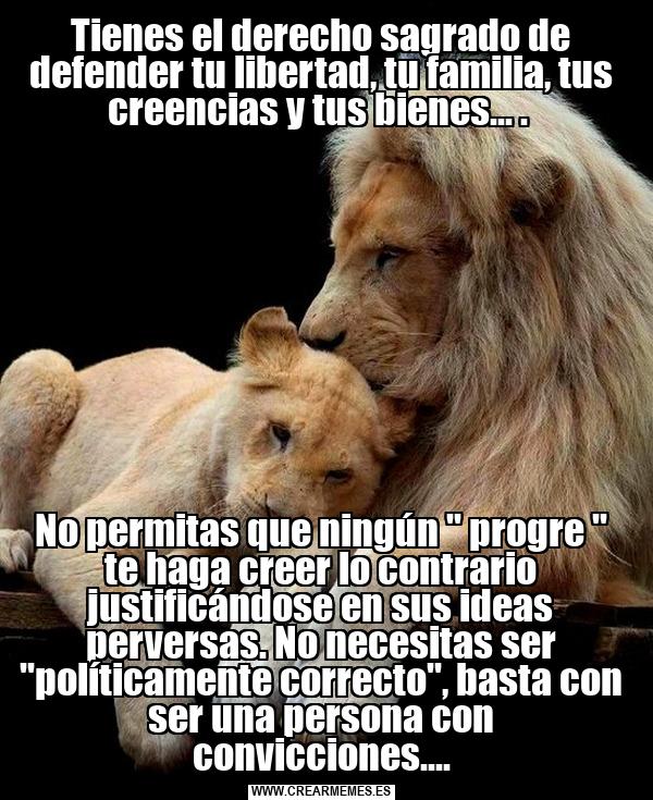 Tienes el derecho sagrado de defender tu libertad, tu familia, tus creencias y tus bienes... . No permitas que ningún " progre " te haga creer lo contrario justificándose en sus ideas perversas. No necesitas ser "políticamente correcto", basta con ser una persona con convicciones....