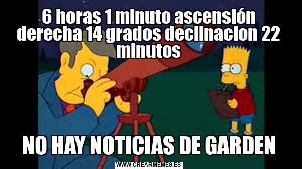 6 horas 1 minuto ascensión derecha 14 grados declinacion 22 minutos NO HAY NOTICIAS DE GARDEN