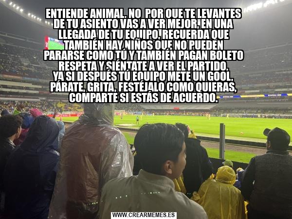 ENTIENDE ANIMAL, NO POR QUE TE LEVANTES DE TU ASIENTO VAS A VER MEJOR, EN UNA LLEGADA DE TU EQUIPO, RECUERDA QUE TAMBIÉN HAY NIÑOS QUE NO PUEDEN PARARSE COMO TÚ Y TAMBIÉN PAGAN BOLETO RESPETA Y SIÉNTATE A VER EL PARTIDO, YA SI DESPUÉS TÚ EQUIP