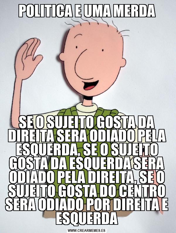 POLITICA E UMA MERDA SE O SUJEITO GOSTA DA DIREITA SERA ODIADO PELA ESQUERDA, SE O SUJEITO GOSTA DA ESQUERDA SERA ODIADO PELA DIREITA, SE O SUJEITO GOSTA DO CENTRO SERA ODIADO POR DIREITA E ESQUERDA