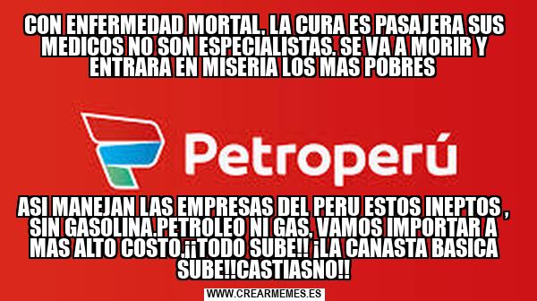 CON ENFERMEDAD MORTAL, LA CURA ES PASAJERA SUS MEDICOS NO SON ESPECIALISTAS, SE VA A MORIR Y ENTRARA EN MISERIA LOS MAS POBRES ASI MANEJAN LAS EMPRESAS DEL PERU ESTOS INEPTOS , SIN GASOLINA,PETROLEO NI GAS, VAMOS IMPORTAR A MAS ALTO COSTO,¡¡TODO SUBE!! ¡LA CANASTA BASICA SUBE!!CASTIASNO!!
