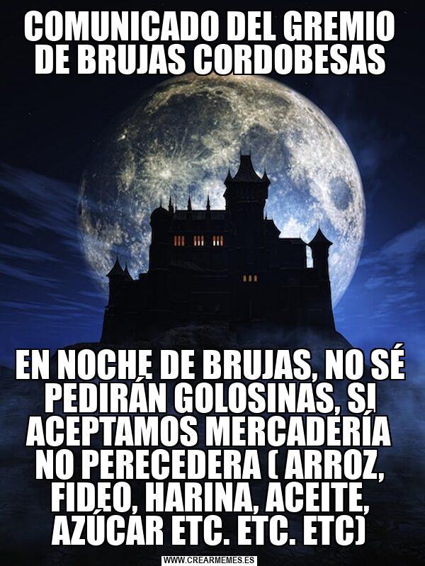 COMUNICADO DEL GREMIO DE BRUJAS CORDOBESAS EN NOCHE DE BRUJAS, NO SÉ PEDIRÁN GOLOSINAS, SI ACEPTAMOS MERCADERÍA NO PERECEDERA ( ARROZ, FIDEO, HARINA, ACEITE, AZÚCAR ETC. ETC. ETC)