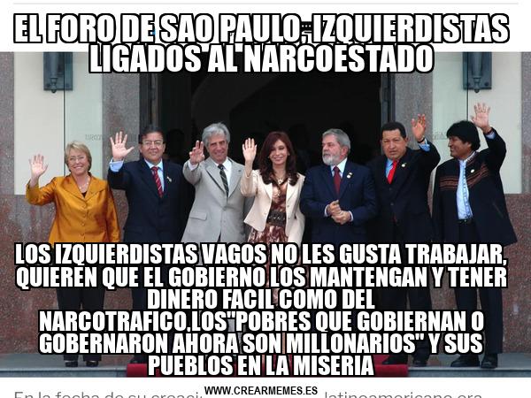 EL FORO DE SAO PAULO, IZQUIERDISTAS LIGADOS AL NARCOESTADO LOS IZQUIERDISTAS VAGOS NO LES GUSTA TRABAJAR, QUIEREN QUE EL GOBIERNO LOS MANTENGAN Y TENER DINERO FACIL COMO DEL NARCOTRAFICO,LOS"POBRES QUE GOBIERNAN O GOBERNARON AHORA SON MILLONARIOS" Y SUS PUEBLOS EN LA MISERIA