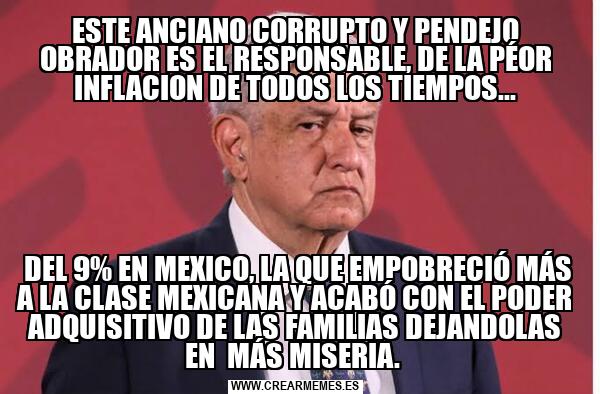 ESTE ANCIANO CORRUPTO Y PENDEJO OBRADOR ES EL RESPONSABLE, DE LA PÉOR INFLACION DE TODOS LOS TIEMPOS... DEL 9% EN MEXICO, LA QUE EMPOBRECIÓ MÁS A LA CLASE MEXICANA Y ACABÓ CON EL PODER ADQUISITIVO DE LAS FAMILIAS DEJANDOLAS EN MÁS MISERIA.