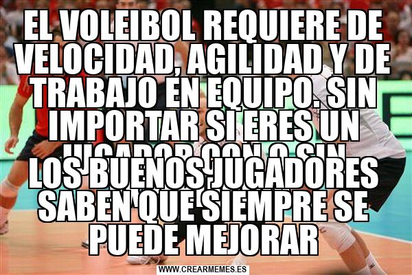 EL VOLEIBOL REQUIERE DE VELOCIDAD, AGILIDAD Y DE TRABAJO EN EQUIPO. SIN IMPORTAR SI ERES UN JUGADOR CON O SIN EXPERIENCIA. LOS BUENOS JUGADORES SABEN QUE SIEMPRE SE PUEDE MEJORAR
