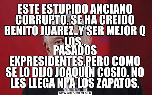 ESTE ESTUPIDO ANCIANO CORRUPTO, SE HA CREIDO BENITO JUAREZ..Y SER MEJOR Q LOS.. PASADOS EXPRESIDENTES,PERO COMO SE LO DIJO JOAQUIN COSIO, NO LES LLEGA NI A LOS ZAPATOS.
