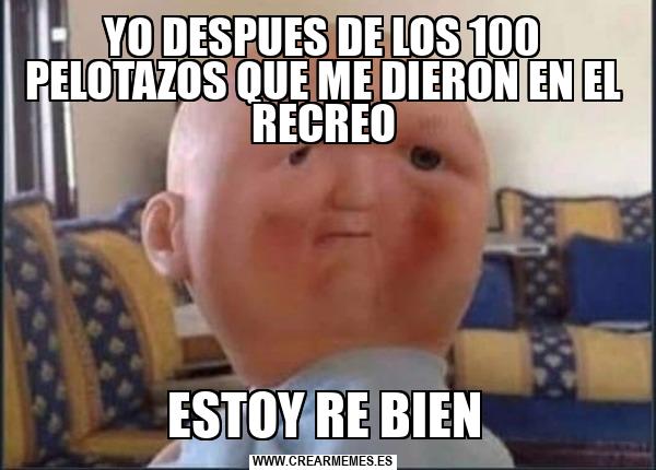 YO DESPUES DE LOS 100 PELOTAZOS QUE ME DIERON EN EL RECREO ESTOY RE BIEN