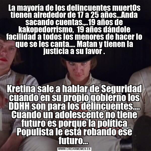 La mayoría de los delincuentes muert0s tienen alrededor de 17 a 25 años...Anda sacando cuentas.,..19 años de kakopedorrismo, 19 años dándole facilidad a todos los menores de hacer lo que se les canta.... Matan y tienen la justicia a su favor . Kretina sale a hablar de Seguridad cuando en su propio gobierno los DDHH son para los delincuentes.... Cuando un adolescente no tiene futuro es porque la política Populista le está robando ese futuro...