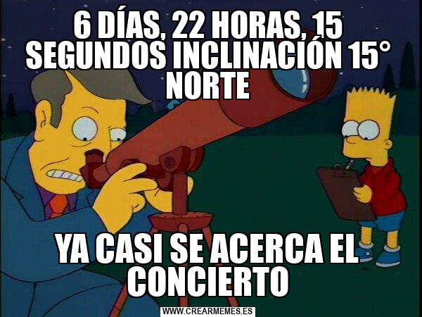 6 DÍAS, 22 HORAS, 15 SEGUNDOS INCLINACIÓN 15° NORTE YA CASI SE ACERCA EL CONCIERTO