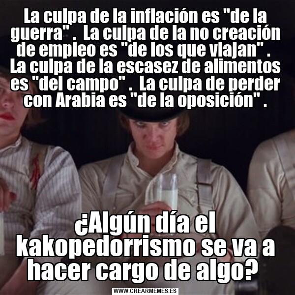 La culpa de la inflación es "de la guerra" . La culpa de la no creación de empleo es "de los que viajan" . La culpa de la escasez de alimentos es "del campo" . La culpa de perder con Arabia es "de la oposición" . ¿Algún día el kakopedorrismo se va a hacer cargo de algo?