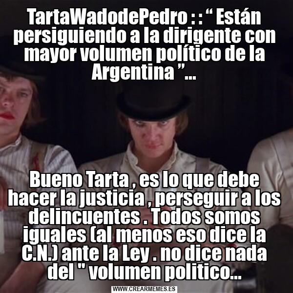 TartaWadodePedro : : “ Están persiguiendo a la dirigente con mayor volumen político de la Argentina ”... Bueno Tarta , es lo que debe hacer la justicia , perseguir a los delincuentes . Todos somos iguales (al menos eso dice la C.N.) ante la Ley . no dice nada del " volumen politico...