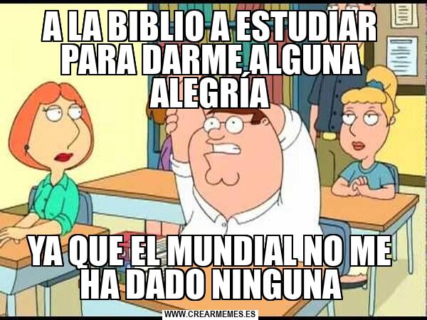 A LA BIBLIO A ESTUDIAR PARA DARME ALGUNA ALEGRÍA YA QUE EL MUNDIAL NO ME HA DADO NINGUNA