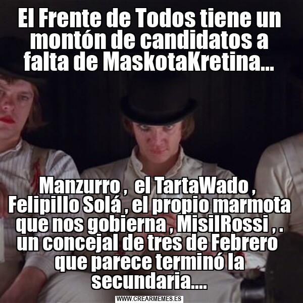 El Frente de Todos tiene un montón de candidatos a falta de MaskotaKretina... Manzurro , el TartaWado , Felipillo Solá , el propio marmota que nos gobierna , MisilRossi , . un concejal de tres de Febrero que parece terminó la secundaria....