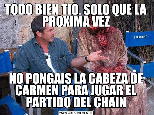 TODO BIEN TIO. SOLO QUE LA PROXIMA VEZ NO PONGAIS LA CABEZA DE CARMEN PARA JUGAR EL PARTIDO DEL CHAIN