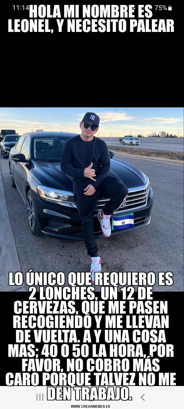 HOLA MI NOMBRE ES LEONEL, Y NECESITO PALEAR LO ÚNICO QUE REQUIERO ES 2 LONCHES, UN 12 DE CERVEZAS, QUE ME PASEN RECOGIENDO Y ME LLEVAN DE VUELTA. A Y UNA COSA MAS; 40 O 50 LA HORA, POR FAVOR, NO COBRO MÁS CARO PORQUE TALVEZ NO ME DEN TRABAJO.