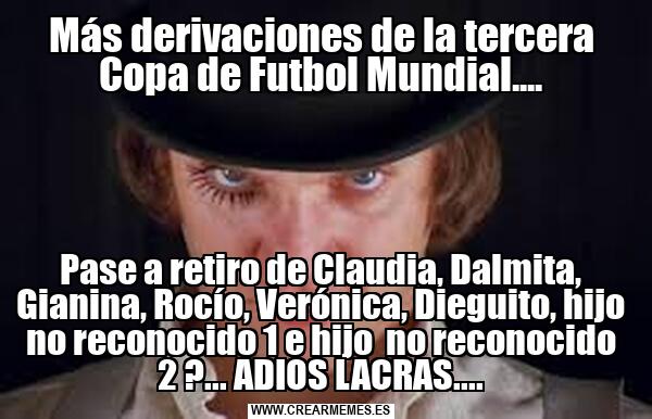 Más derivaciones de la tercera Copa de Futbol Mundial.... Pase a retiro de Claudia, Dalmita, Gianina, Rocío, Verónica, Dieguito, hijo no reconocido 1 e hijo no reconocido 2 ?... ADIOS LACRAS....