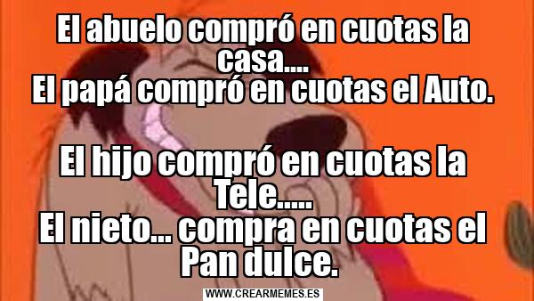 El abuelo compró en cuotas la casa.... El papá compró en cuotas el Auto. El hijo compró en cuotas la Tele..... El nieto... compra en cuotas el Pan dulce.