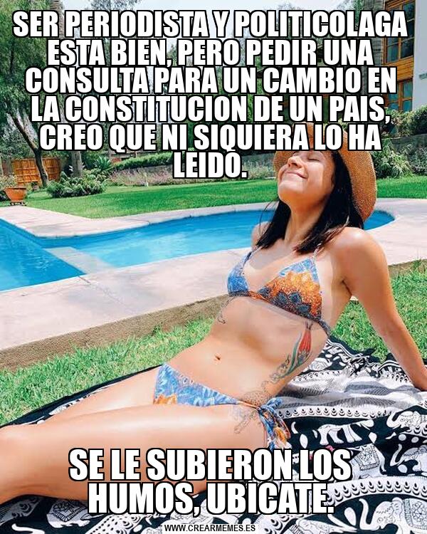 SER PERIODISTA Y POLITICOLAGA ESTA BIEN, PERO PEDIR UNA CONSULTA PARA UN CAMBIO EN LA CONSTITUCION DE UN PAIS, CREO QUE NI SIQUIERA LO HA LEIDO. SE LE SUBIERON LOS HUMOS, UBICATE.