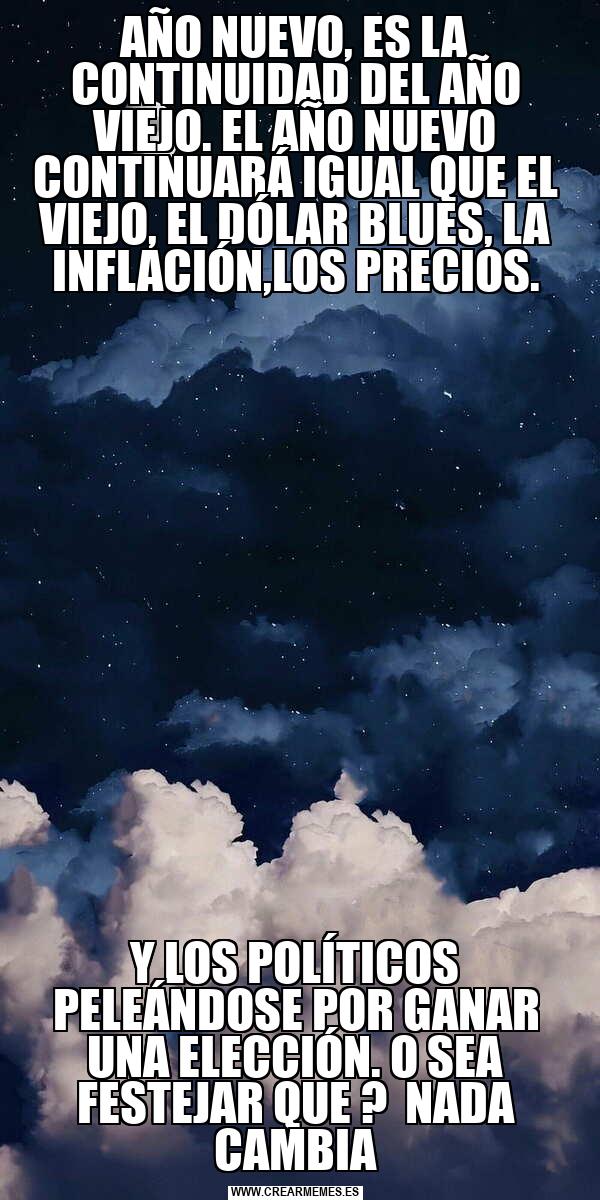 AÑO NUEVO, ES LA CONTINUIDAD DEL AÑO VIEJO. EL AÑO NUEVO CONTINUARÁ IGUAL QUE EL VIEJO, EL DÓLAR BLUES, LA INFLACIÓN,LOS PRECIOS. Y LOS POLÍTICOS PELEÁNDOSE POR GANAR UNA ELECCIÓN. O SEA FESTEJAR QUE ? NADA CAMBIA