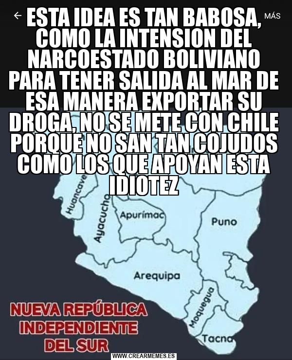 ESTA IDEA ES TAN BABOSA, COMO LA INTENSION DEL NARCOESTADO BOLIVIANO PARA TENER SALIDA AL MAR DE ESA MANERA EXPORTAR SU DROGA, NO SE METE CON CHILE PORQUE NO SAN TAN COJUDOS COMO LOS QUE APOYAN ESTA IDIOTEZ