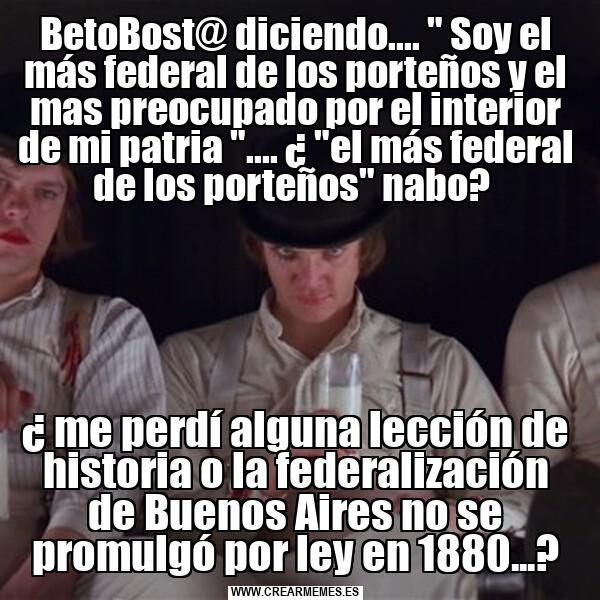 BetoBost@ diciendo.... " Soy el más federal de los porteños y el mas preocupado por el interior de mi patria ".... ¿ "el más federal de los porteños" nabo? ¿ me perdí alguna lección de historia o la federalización de Buenos Aires no se promulgó por ley en 1880...?