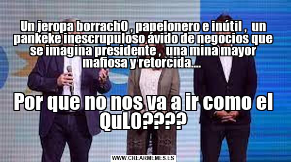 Un jeropa borrach0 , papelonero e inútil , un pankeke inescrupuloso ávido de negocios que se imagina presidente , una mina mayor mafiosa y retorcida.... Por que no nos va a ir como el QuL0????