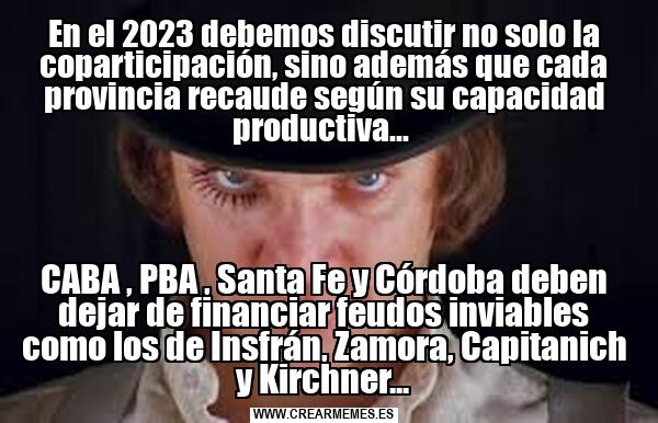 En el 2023 debemos discutir no solo la coparticipación, sino además que cada provincia recaude según su capacidad productiva... CABA , PBA , Santa Fe y Córdoba deben dejar de financiar feudos inviables como los de Insfrán, Zamora, Capitanich y Kirchner...
