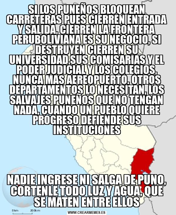 SI LOS PUNEÑOS BLOQUEAN CARRETERAS PUES CIERREN ENTRADA Y SALIDA, CIERREN LA FRONTERA PERUBOLIVIANA ES SU NEGOCIO, SI DESTRUYEN CIERREN SU UNIVERSIDAD,SUS COMISARIAS Y EL PODER JUDICIAL Y LOS COLEGIOS, NUNCA MAS AEREOPUERTO. OTROS DEPARTAMENTOS LO NE NADIE INGRESE NI SALGA DE PUNO, CORTENLE TODO LUZ Y AGUA, QUE SE MATEN ENTRE ELLOS
