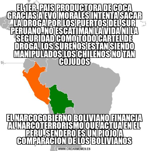 EL 1ER. PAIS PRODUCTORA DE COCA GRACIAS A EVO MORALES INTENTA SACAR LA DROGA POR LOS PUERTOS DEL SUR PERUANO, NO ESCATIMAN LA VIDA NI LA SEGURIDAD COMO TODO CARTEL DE DROGA, LOS SUREÑOS ESTAN SIENDO MANIPULADOS,LOS CHILENOS NO TAN COJUDOS EL NARCOGOBIERNO BOLIVIANO FINANCIA AL NARCOTERRORISMO QUE ACTUA EN EL PERU, SENDERO ES UN PIOJO A COMPARACION DE LOS BOLIVIANOS