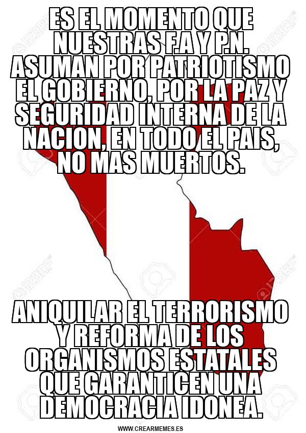 ES EL MOMENTO QUE NUESTRAS F.A Y P.N. ASUMAN POR PATRIOTISMO EL GOBIERNO, POR LA PAZ Y SEGURIDAD INTERNA DE LA NACION, EN TODO EL PAIS, NO MAS MUERTOS. ANIQUILAR EL TERRORISMO Y REFORMA DE LOS ORGANISMOS ESTATALES QUE GARANTICEN UNA DEMOCRACIA IDONEA.
