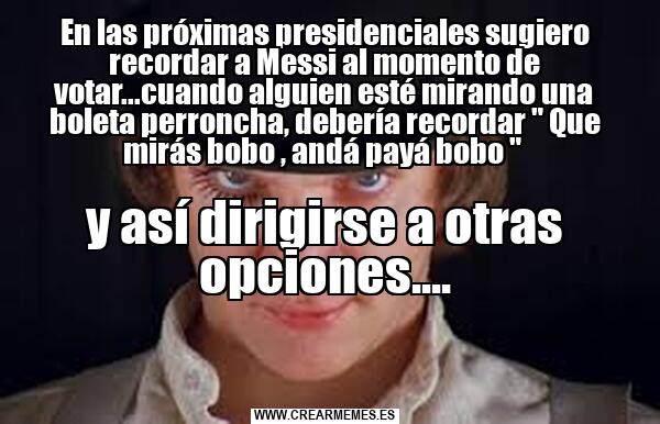 En las próximas presidenciales sugiero recordar a Messi al momento de votar...cuando alguien esté mirando una boleta perroncha, debería recordar " Que mirás bobo , andá payá bobo " y así dirigirse a otras opciones....