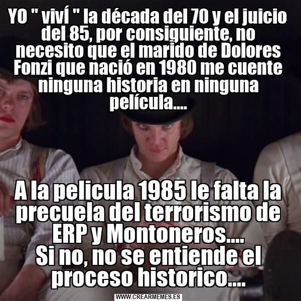 YO " vivÍ " la década del 70 y el juicio del 85, por consiguiente, no necesito que el marido de Dolores Fonzi que nació en 1980 me cuente ninguna historia en ninguna película.... A la pelicula 1985 le falta la precuela del terrorismo de ERP y Montoneros.... Si no, no se entiende el proceso historico....