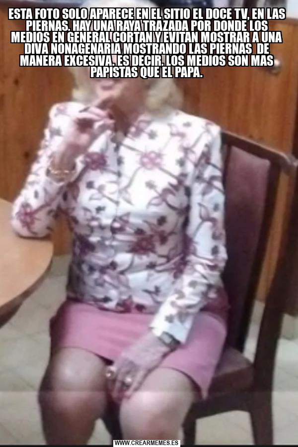 ESTA FOTO SOLO APARECE EN EL SITIO EL DOCE TV, EN LAS PIERNAS, HAY UNA RAYA TRAZADA POR DONDE LOS MEDIOS EN GENERAL CORTAN Y EVITAN MOSTRAR A UNA DIVA NONAGENARIA MOSTRANDO LAS PIERNAS DE MANERA EXCESIVA. ES DECIR, LOS MEDIOS SON MAS PAPISTAS QUE EL