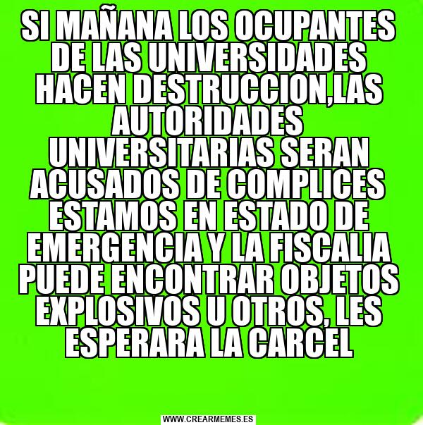 SI MAÑANA LOS OCUPANTES DE LAS UNIVERSIDADES HACEN DESTRUCCION,LAS AUTORIDADES UNIVERSITARIAS SERAN ACUSADOS DE COMPLICES ESTAMOS EN ESTADO DE EMERGENCIA Y LA FISCALIA PUEDE ENCONTRAR OBJETOS EXPLOSIVOS U OTROS, LES ESPERARA LA CARCEL