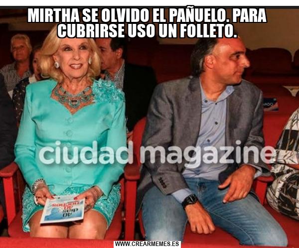 MIRTHA SE OLVIDO EL PAÑUELO. PARA CUBRIRSE USO UN FOLLETO.