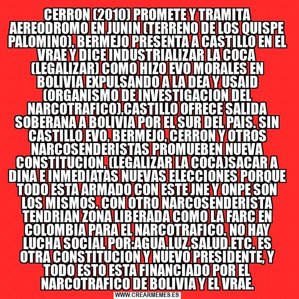 CERRON (2010) PROMETE Y TRAMITA AEREODROMO EN JUNIN (TERRENO DE LOS QUISPE PALOMINO), BERMEJO PRESENTA A CASTILLO EN EL VRAE Y DICE INDUSTRIALIZAR LA COCA (LEGALIZAR) COMO HIZO EVO MORALES EN BOLIVIA EXPULSANDO A LA DEA Y USAID (ORGANISMO DE INVESTIG