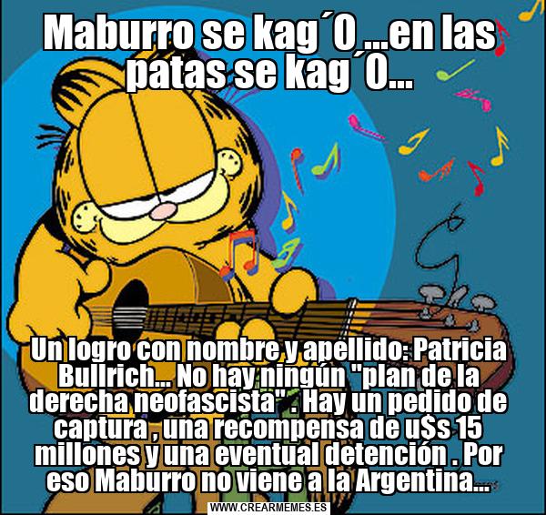 Maburro se kag´0 ...en las patas se kag´0... Un logro con nombre y apellido: Patricia Bullrich... No hay ningún "plan de la derecha neofascista" . Hay un pedido de captura , una recompensa de u$s 15 millones y una eventual detención . Por eso Maburro no viene a la Argentina...