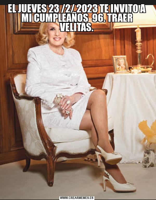 EL JUEVES 23 /2/ 2023 TE INVITO A MI CUMPLEAÑOS 96. TRAER VELITAS.