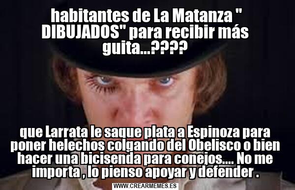 habitantes de La Matanza " DIBUJADOS" para recibir más guita...???? que Larrata le saque plata a Espinoza para poner helechos colgando del Obelisco o bien hacer una bicisenda para conejos.... No me importa , lo pienso apoyar y defender .