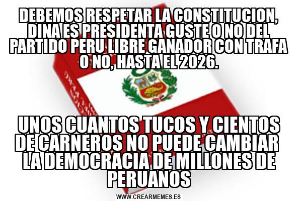 DEBEMOS RESPETAR LA CONSTITUCION, DINA ES PRESIDENTA GUSTE O NO DEL PARTIDO PERU LIBRE GANADOR CON TRAFA O NO, HASTA EL 2026. UNOS CUANTOS TUCOS Y CIENTOS DE CARNEROS NO PUEDE CAMBIAR LA DEMOCRACIA DE MILLONES DE PERUANOS
