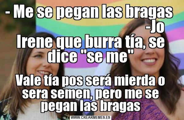 - Me se pegan las bragas -Jo Irene que burra tía, se dice "se me" Vale tía pos será mierda o sera semen, pero me se pegan las bragas