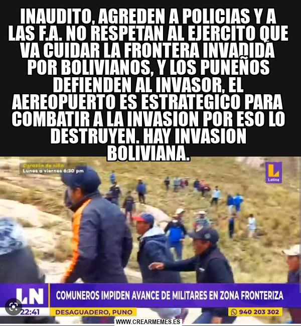 INAUDITO, AGREDEN A POLICIAS Y A LAS F.A. NO RESPETAN AL EJERCITO QUE VA CUIDAR LA FRONTERA INVADIDA POR BOLIVIANOS, Y LOS PUNEÑOS DEFIENDEN AL INVASOR, EL AEREOPUERTO ES ESTRATEGICO PARA COMBATIR A LA INVASION POR ESO LO DESTRUYEN. HAY INVASION BOLI