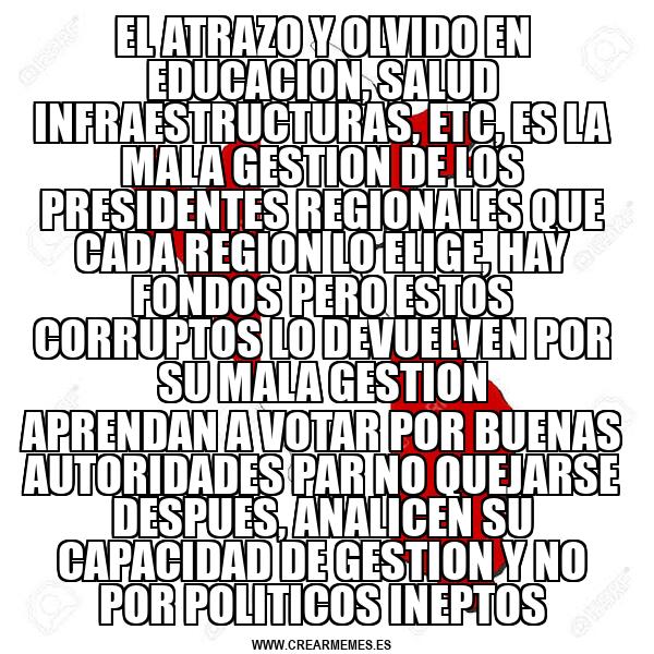 EL ATRAZO Y OLVIDO EN EDUCACION, SALUD INFRAESTRUCTURAS, ETC, ES LA MALA GESTION DE LOS PRESIDENTES REGIONALES QUE CADA REGION LO ELIGE, HAY FONDOS PERO ESTOS CORRUPTOS LO DEVUELVEN POR SU MALA GESTION APRENDAN A VOTAR POR BUENAS AUTORIDADES PAR NO QUEJARSE DESPUES, ANALICEN SU CAPACIDAD DE GESTION Y NO POR POLITICOS INEPTOS